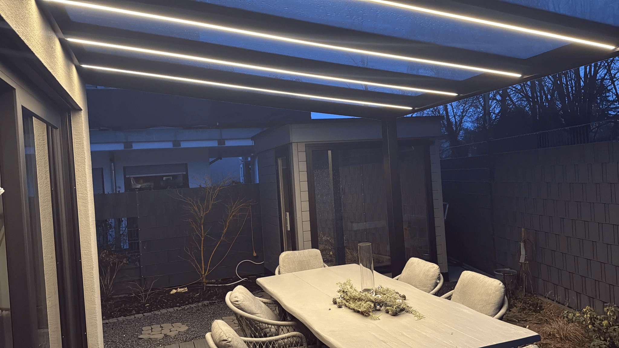 Genießen Sie auch an kühlen Tagen Ihre Terrasse. Die Schiebeelemente des Sommergartens lassen sich im Winter mit einsetzbaren Leisten etwas isolieren. Die Dachneigung beträgt 20 %. Der Sommergarten ist aus Aluminium gefertigt.
